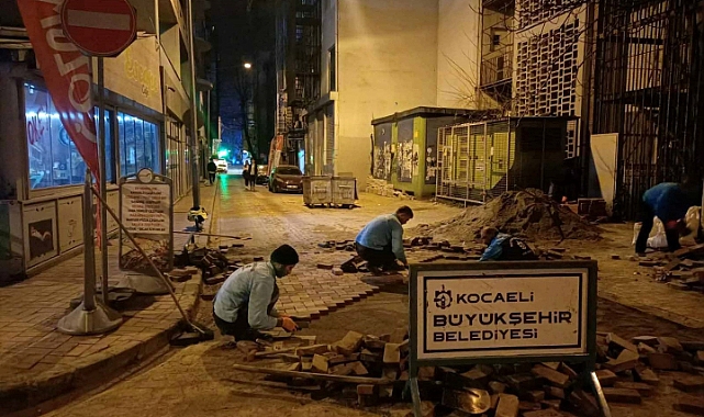Kocaeli Büyükşehir Belediyesi Yol Bakım Timi, yaya ve araç trafiğini aksatmamak için mesai saatleri dışında da çalışmalarını gece geç saatlerde yapıyor. İzmit Naci Girgin Sokakta gece yarısı parke kaldırım onarımı yapan ekipler, Ömer Türkçakal Bulvarında da asfalt onarım çalışması yaptı.